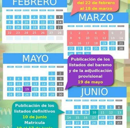 Por último, la relación provisional de estudiantes admitidos en ESO y Bachillerato se conocerá el 3 de junio y la definitiva el 2 de julio. A partir de esa fecha, y hasta el día 7 de julio, permanecerá abierto el plazo de matrícula.