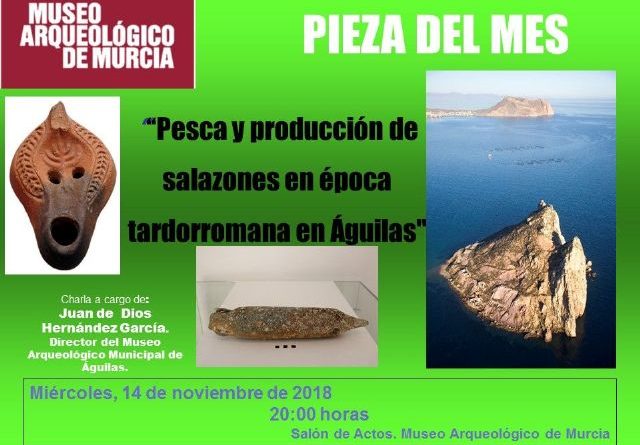 El arqueólogo municipal, Juan de Dios Hernández, ofrecerá el próximo miércoles una conferencia sobre Pesca y Producción de Salazones en época tardorromana en Águilas que se llevará a cabo en el Museo Arqueológico Provincial; un espacio en el que, cabe destacar, actualmente hay expuestas una serie de piezas de relacionadas con la pesca y la producción de salazones en época romana (anzuelos, pesas de red, ánfora, lanzaderas para reparar redes , restos de salazón de pescado, etc.) procedentes del museo arqueológico de la localidad que han sido cedidas temporalmente al museo murciano.