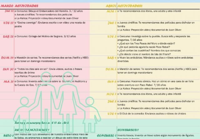 Así, desde el Ayuntamiento se propondrán actividades periódicas para realizar en casa, además de dos retos para realizar en familia. Los participantes en las distintas propuestas participarán en un concurso por categorías de edad (Infantil: 3-6 años; Primaria: 7-12 años; Secundaria: 13-16 años) de un lote de material escolar que será entregada una vez concluido el periodo de confinamiento (solo para las actividades que se incluyan dentro del apartado concurso o reto). Para poder participar será necesario enviar una foto de la actividad realizada al correo aguilassedivierteencasa@gmail.com. Todas las propuestas recibidas serán expuestas en las redes sociales de la Concejalía de Participación Ciudadana.