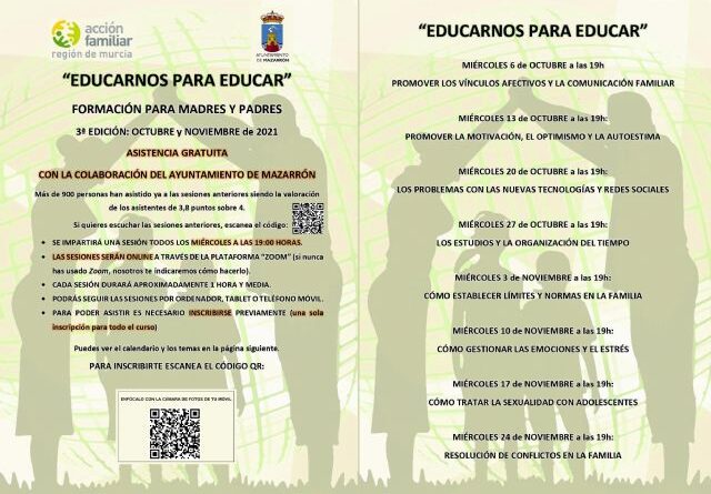 En colaboración con el Ayuntamiento de Mazarrón ha puesto en marcha el plan “Educarnos para educar”, (Formación para madres y padres) dirigido a las familias del municipio y contando con centros, asociaciones, empresas o colectivos donde puedan encontrarse los beneficiarios potenciales de este proyecto.