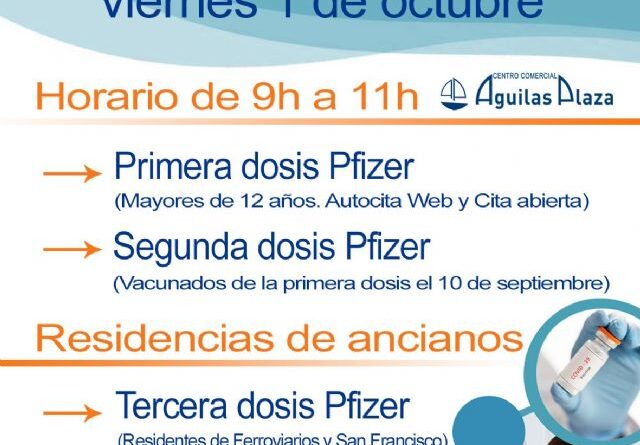 Además, también podrán acudir al Centro Comercial Águilas Plaza y ser vacunados, sin necesidad de pedir cita, todas aquellas personas mayores de 12 años que aún no se hayan vacunado y estén empadronados en la Región de Murcia.