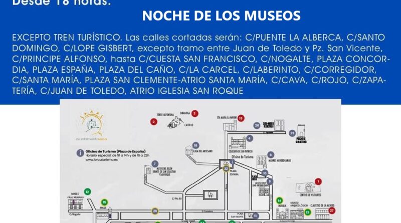 Lorca, 17 de mayo de 2024. 2024. El concejal de Seguridad Ciudadana, Juan Miguel Bayonas, ha informado de que la Policía Local de Lorca realizará, este próximo sábado, 18 de mayo, el corte del tráfico rodado, excepto del Tren Turístico, en distintas calles de la ciudad con motivo de la celebración de ‘La noche de los Museos’.