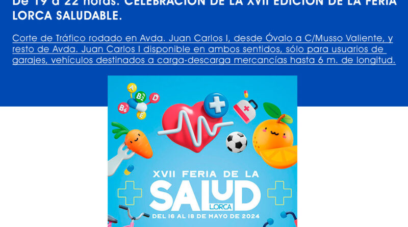 Corte al tráfico rodado este viernes, 17 de mayo, con motivo de la celebración de la XVII Feria de la Salud de Lorca