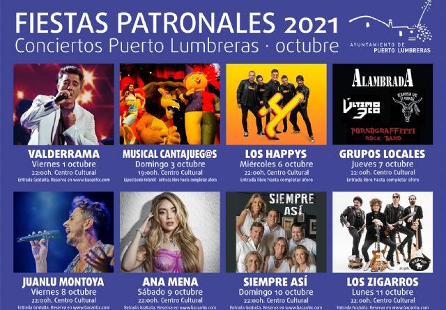 El Ayuntamiento de Puerto Lumbreras ha ampliado en 400 plazas el aforo de los conciertos gratuitos de las Fiestas Patronales 2021 que tendrán lugar en el patio del Centro Cívico, y cuya programación de actividades arrancará este viernes con la actuación de Juan Valderrama, y se extenderá hasta el próximo 12 de octubre. Las entradas podrán adquirirse, con un único coste de 1’50 euros en concepto de gastos de gestión de la plataforma, a partir de este jueves 30 de septiembre en www.bacantix.com y de forma presencial en la Biblioteca Municipal, con un máximo de 2 entradas por persona. En este caso el horario de venta será de lunes a viernes de 10:00 a 13:00 y de 17:00 a 20:00 horas, y será necesario presentar DNI.