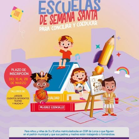 Pérez Segura ha apuntado que «las ‘Escuelas de Semana Santa para Conciliar y Coeducar’ se desarrollarán en los colegios ‘San Fernando’, ‘Ana Caicedo Richard’, ‘Sagrado Corazón’, ‘Torrecilla, ‘Juan Navarro García’ de La Hoya y en el Centro Cívico de La Paca, en un programa, que tendrá lugar del 8 al 18 de abril, de lunes a viernes en horario de 7:45 a 15:15 horas, permitiendo atender a niños y niñas con edades comprendidas entre 3 y 12 años, matriculados en los centros de educación infantil y primaria de todo el término municipal o que figuren en el padrón municipal de habitantes de Lorca, mientras sus padres y madres están trabajando o recibiendo formación para el empleo».