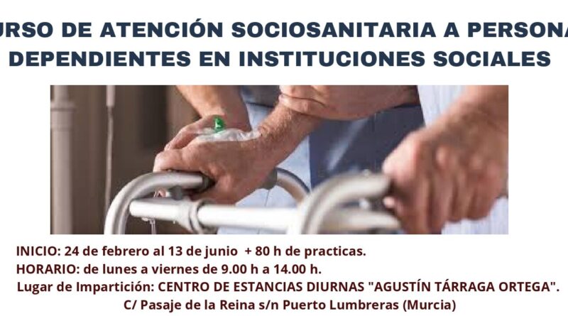 10 de enero de 2025. La concejal de Empleo y Formación del Ayuntamiento de Puerto Lumbreras, Juana María Pérez, ha informado de la apertura del plazo de inscripción para el Curso de Atención Sociosanitaria a Personas Dependientes en Instituciones Sociales.