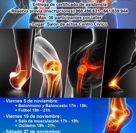 Los primeros talleres irán orientados a los practicantes de baloncesto y balonmano, el próximo viernes 5 de noviembre de 17.00 a 19.00 horas. El mismo día se celebrará el taller para jugadores de fútbol (de 19.00 a 21.00 horas). Ya el viernes 19 de noviembre el taller de prevención de lesiones tratará sobre las salas de musculación (de 17.00 a 19.00 h.) y ciclismo (19.00 a 21.00 horas). Para el sábado 27 de noviembre tendrán lugar los de pádel y tenis (de 10.00 a 12.00 horas) y atletismo (de 12.00 a 14.00 horas).