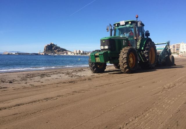 El Ayuntamiento de Águilas continúa con los trabajos de puesta a punto de las playas de la localidad de cara a Semana Santa; unas actuaciones que- destacaba la edil de Empresas Prestadoras de Servicios, Isabel Fernández- «se han visto perjudicadas por los temporales sufridos en los últimos días que han hecho necesario repetir muchos de los trabajos que ya se habían realizado».