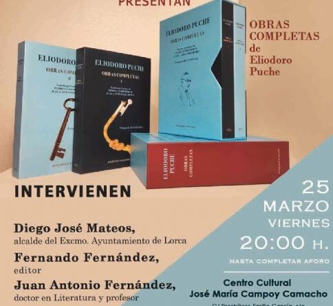 La concejala de Cultura ha indicado que «la presentación de las obras de Eliodoro Puche, una de las personalidades literarias de nuestra ciudad más importante hasta nuestros días, tendrá lugar a partir de las 20 hroas y contará con la presencia del alcalde de Lorca, Diego José Mateos, del editor de la publicación, Fernando Fernández, del doctor en Literatura y profesor, Juan Antonio Fernández y del catedrático y poeta, Pedro Guerrero».