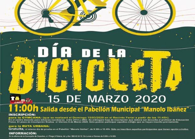 El Día de la Bicicleta se celebrará el domingo 15 de marzo, con salida en el Pabellón de Deportes «Manolo Ibáñez» (11:00 horas) y llegada al recinto ferial, una actividad que está organizada por la Concejalía de Deportes y Terra Sport Ciclyng.