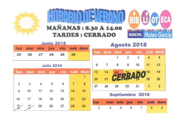 El horario de la Biblioteca «Mateo Garcia» será de 8:30 a 14:00 horas del 25 de junio hasta el 7 de septiembre