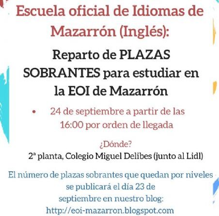 Este martes 24 de septiembre, se va a proceder a repartir las plazas sobrantes de la Escuela Oficial de Idiomas de Mazarrón del idioma de Inglés. Será a partir de las cuatro de la tarde en la segunda planta del IES Miguel Delibes de Puerto de Mazarrón y, como es habitual, las plazas se adjudicarán por orden de llegada de los interesados al centro.