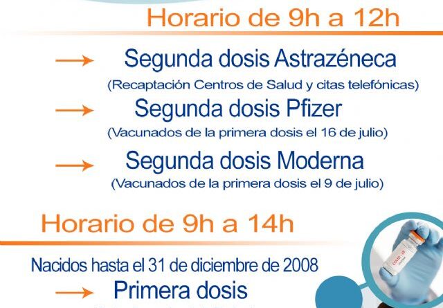 De 9:00h a 12:00h, recibirán la segunda dosis de Astrazéneca las personas recaptadas a través de los Centros de Salud o por teléfono, que deberán acudir con su nota informativa en mano. Serán unas 150 personas.