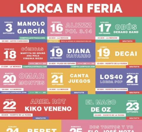 «El miércoles, 21 de septiembre, en la explanada del antiguo Claustro de La Merced los más pequeños disfrutarán de la actuación gratuita de Cantajuegos a las 19:30 horas y, además, en el recinto ferial del Huerto de la Rueda tendrá lugar el concierto gratuito de Los 40 Lorca Pop a las 22:00 horas».