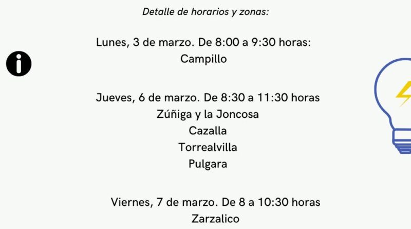 Esta suspensión temporal de energía eléctrica se llevará a cabo los días 3, 6 y 7 de marzo, en horario de mañana en Campillo, Zuñiga, Cazalla, La Pulgara, Torrelavilla y Zarzalico