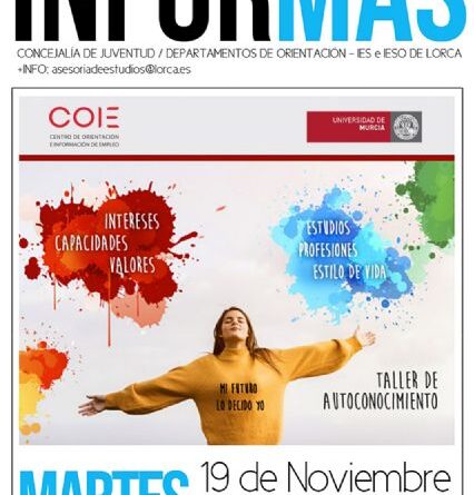 El concejal de Juventud del Ayuntamiento de Lorca, José Ángel Ponce, ha anunciado que, para este próximo martes, 19 de noviembre, el Centro de Orientación e Información de Empleo (COIE) dependiente de la Universidad de Murcia ha organizado un Taller de Autoconocimiento en colaboración con la Concejalía de Juventud y Universidades del Ayuntamiento de Lorca, y a través del Campus Universitario lorquino.