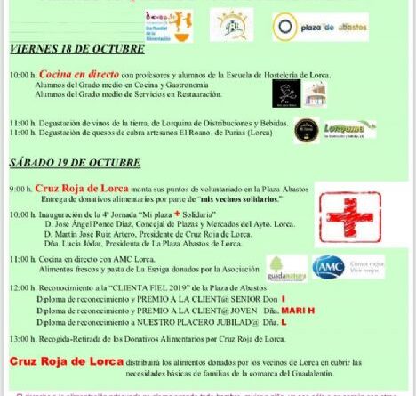 Para el sábado, 19 de octubre, desde las 9 horas, Cruz Roja de Lorca montará sus puntos de voluntariado en la Plaza de Abastos donde se podrán entregar donativos alimentarios por parte de «mis vecinos solidarios». A las 10 horas está prevista la inauguración oficial de «Mi plaza + solidaria» que contará con la presencia del concejal de Plazas y Mercados del Ayuntamiento de Lorca, José Ángel Ponce, el presidente de Cruz Roja Lorca, Martín Ruiz Artero y de la presidenta de la Plaza de Abastos de Lorca, Lucía Jódar.