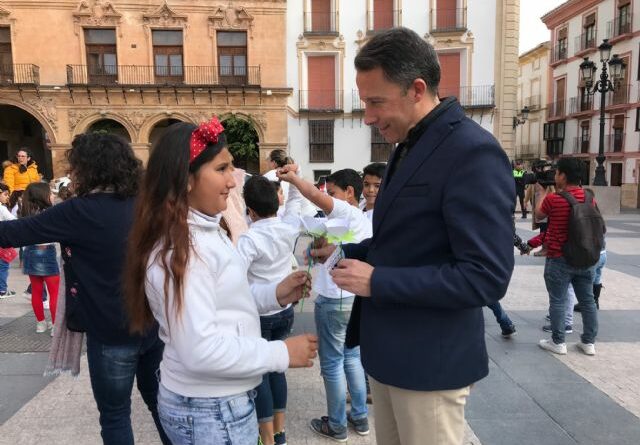 Los niños, que han regalado al Alcalde y a los concejales flores blancas de papel realizadas por ellos mismos, también han recorrido las principales calles de la ciudad para repartir estas manualidades entre los lorquinos como gesto de paz y solidaridad