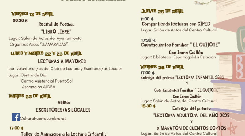 “Además, coincidiendo con la fecha exacta del Día Internacional del Libro, el 23 de abril, tendrá lugar la publicación de un vídeo con escritores y escritoras locales y que podrá verse en la cuenta oficial de Facebook de Cultura y Biblioteca de Puerto Lumbreras, Cultura Puerto Lumbreras, y a las 17:00 horas se celebrará el Taller de animación a la lectura infantil en la Biblioteca Municipal”.