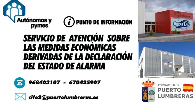La Concejalía de Dinamización Económica y Desarrollo Local del Ayuntamiento de Puerto Lumbreras ha puesto en marcha un servicio de atención para las pequeñas y medianas Empresas y autónomos que necesitan asesoramiento sobre las medidas económicas derivadas de la declaración de estado de alarma en nuestro país ante la crisis sanitaria por COVID-19. De esta forma, a través de los teléfonos 968403107 y 670425907 y el e-mail cife2@puertolumbreras.es, autónomos y pymes pueden obtener asesoramiento gratuito sobre medidas municipales, regionales y estatales adoptadas y de las que pueden beneficiarse por las consecuencias económicas de la restricción de movimientos y el cierre de los establecimientos y negocios tras el decreto del Estado de Alarma, a excepción de los considerados de primera necesidad.