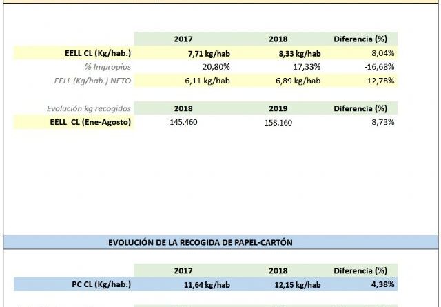 En 2018 los lumbrerenses depositaron en los contenedores amarillos destinados a la recogida de latas, briks y envases de plástico8’33 kg por habitante, lo que supone un 8’04% más que en el año 2017. Además, en lo que va de año 2019 el incremento de los kilos recogidos de envases ligeros llega al 8’73%, pasando de 145.460 Kg en 2018 a 158.160 Kg de enero a agosto de este año. También se recicla mejor, puesto que la cifra de impropios (residuos que son depositados incorrectamente en un contenedor) bajó un 16’68% de 2017 a 2018.