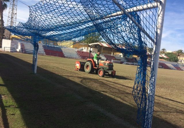 La Concejalía de Deportes del Ayuntamiento de Totana está realizando durante esta semana los trabajos de acondicionamiento y resiembra del césped del estadio municipal de fútbol «Juan Cayuela» con el fin de hacer uso en las mejores condiciones de esta instalación hasta finales de la presente temporada.