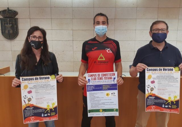 El concejal de Deportes, Agustín Gonzalo Martínez, y los representantes del Club de Tenis, los monitores Pedro Cánovas y Patricia Salas, han presentado la oferta que se desarrollará del 28 de junio al 30 de julio y durante el mes de agosto en función de la demanda de inscripciones.